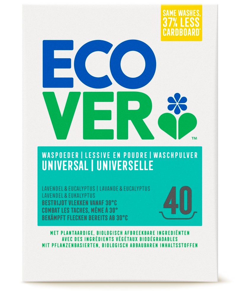 Ecover Universal Waspoeder is een ecologische krachtpatser die vuil en vlekken verwijdert uit eigenlijk al uw soorten was. Of het nu beddengoed is, handdoeken of babykleding, deze alleskunner klaart de klus. Dit product op basis van plantaardige en minerale ingrediënten laat